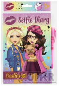 Pamiętnik selfie 21 x 15 cm i magiczny długopis (który widać tylko przy pomocy specjalnego światła lampki zawartej także w długopisie). Wewnątrz 50 różowych kartek A5 w linię. Dostępne dwa warianty, z różowym lub fioletowym długopisem.