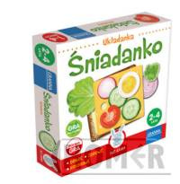Układanka dla najmłodszych. Dziecko ma do dyspozycji, bułeczkę, kromkę chleba, plasterki sera i jajka oraz wiele kolorowych plasterków warzyw. Może bawić się w przygotowywanie śniadanka dla siebie i dla innych domowników. Ćwiczy wiele pojęć, pod, na, obok. Śniadanko to „pyszna", kolorowa zabawa.